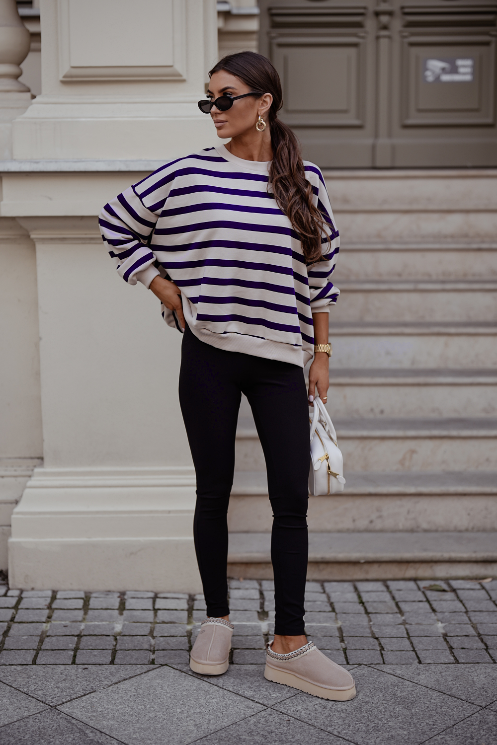 Jej unikalny design wyróżnia się beżowo-granatowymi paskami, które nadają odzieży nowoczesny i elegancki charakter. Ta bluza doskonale komponuje się z różnorodnymi stylizacjami, dlatego bez trudu można ją zestawić zarówno z dżinsami, jak i spódnicą. Idealna na co dzień oraz na mniej formalne spotkania, zapewnia swobodę ruchów oraz uniwersalność, co czyni ją must-have w każdej szafie.