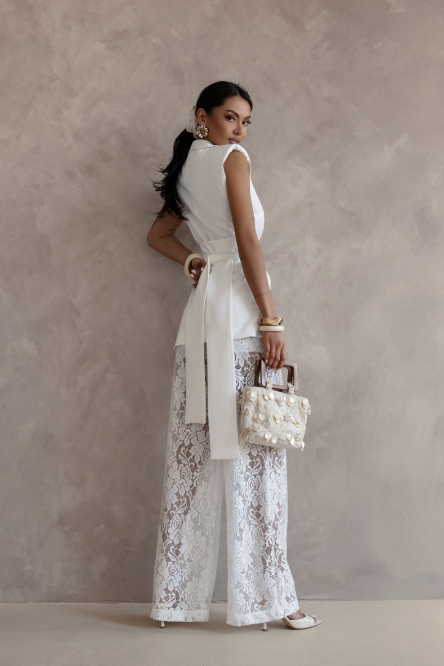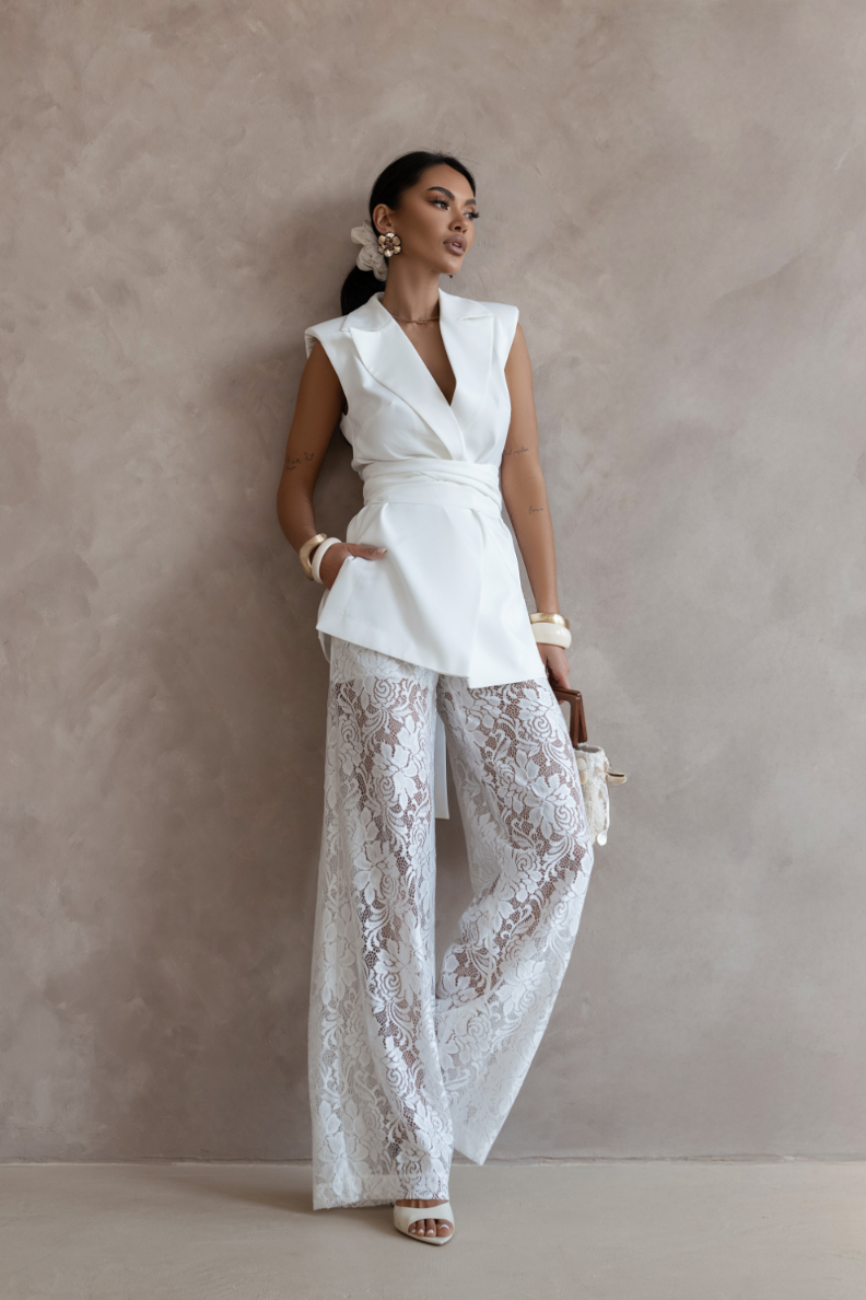 Model are 175 cm înălțime și arată dimensiunile XS/S, ceea ce te poate ajuta să evaluezi vizual potrivirea. Setul AURA se potrivește bine atât cu ținute casual, cât și cu cele mai formale - poate fi asortat cu o cămașă clasică, un top minimalist sau accesorii elegante.